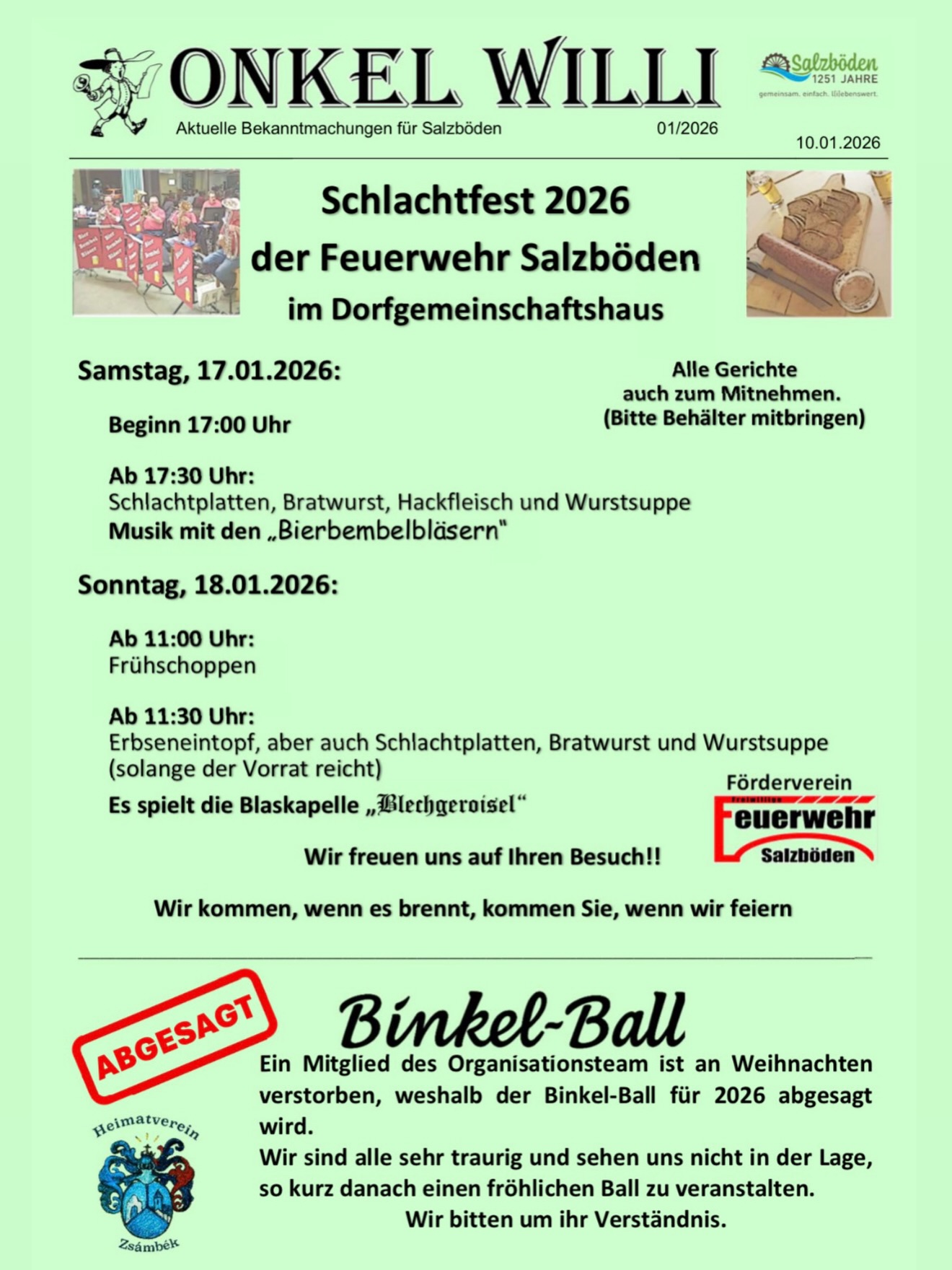 Die neue Chronik "1250 Jahre Salzböden" ist da! Alle Bestellungen aus dem letzten Jahr müssen bis zum 18.01.2026 abgeholt sein, sonst gehen sie in den freien Verkauf. Nachbestellungen können noch bis zum 18.01.26 unter 06406 830392 oder per E-Mail an chronik1250@salzboeden.de aufgegeben werden. Nach dem 18.01.2025 wird es keine Bestellmöglichkeit mehr geben.